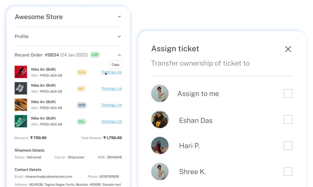 Detailed right panel to showcase order details & status (past and present), along with abandoned cart details